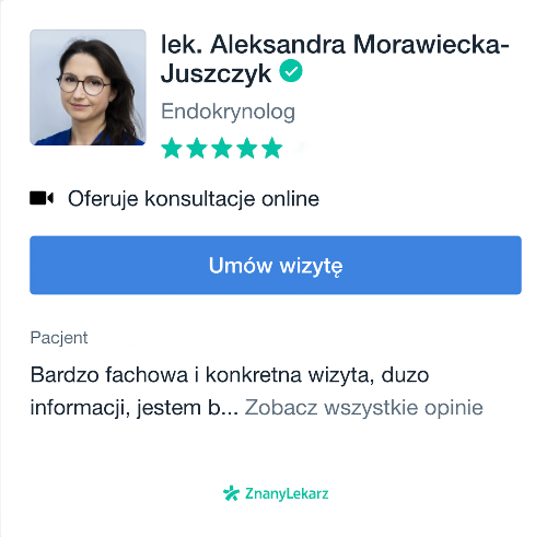 Pani doktor Aleksandra Morawiecka-Juszczyk to specjalista endokrynolog dorosłych. Szkolenie specjalizacyjne realizowała w Klinice Endokrynologii Szpitala Uniwersyteckiego w Krakowie, zdała Państwowy Egzamin Specjalizacyjny jeszcze w trakcie specjalizacji. Jest absolwentką Wydziału Lekarskiego Collegium Medicum Uniwersytetu Jagiellońskiego.